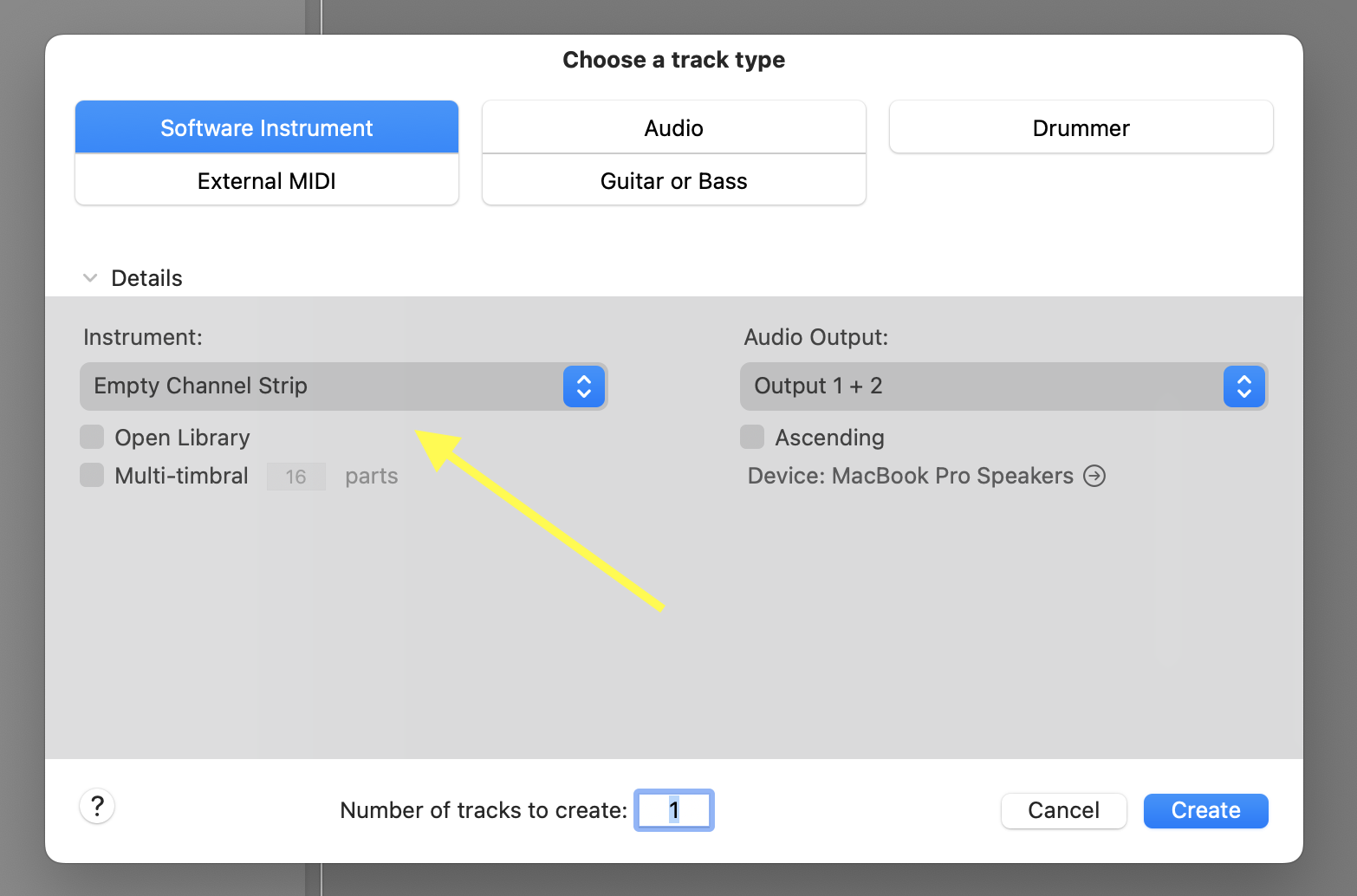 • Create a new Software instrument track (make you choose "Empty Channel Strip" in the "Instrument" section).