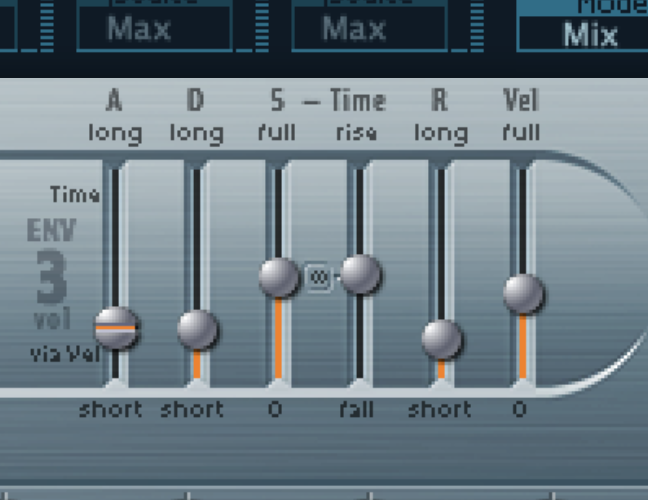 • Adjust the various values of the ADSR 3 envelop. Try the following: 50ms Attack, 50ms Decay, 0.05 Sustain, and 50 Release; then try 4000ms Attack, 100ms Decay, 1. Sustain, and 4000 Release.