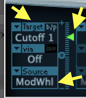 • Try controlling the CUT knob of the FILTER 1 using the MODWHEEL on the keyboard: Choose CUTOFF 1 as the TARGET, MODWHL as the SOURCE, and adjust the green slider to about 0.6. Play some notes and move to the MODWHEEL on the keyboard to hear filtering effect.