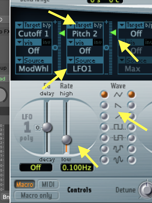 • Try controlling the PITCH of the TONE GENERATOR 2 using the LFO 1: Choose PITCH 2 as the TARGET, LFO1 as the SOURCE, and adjust the green slider to about 0.6. Then change the RATE slider and try out different WAVE types.