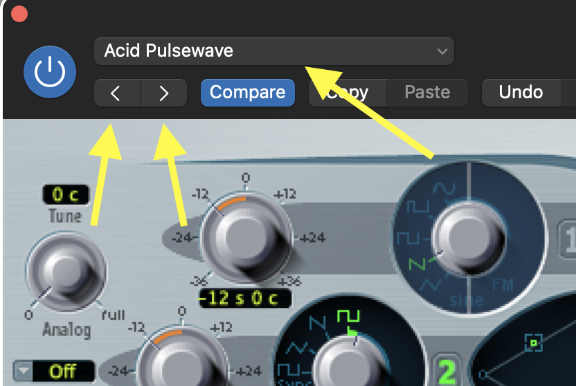 • On the new track, load the ES2 synth, and choose a preset that you like. To do this, simply choose the first preset on the list, then, WHILE PLAYING ON THE KEYBOARD, click on the LEFT and RIGHT arrows to go to the next preset. Stop when you find something you like; however, choose something that's harmonically rich (not just pure sine tones).