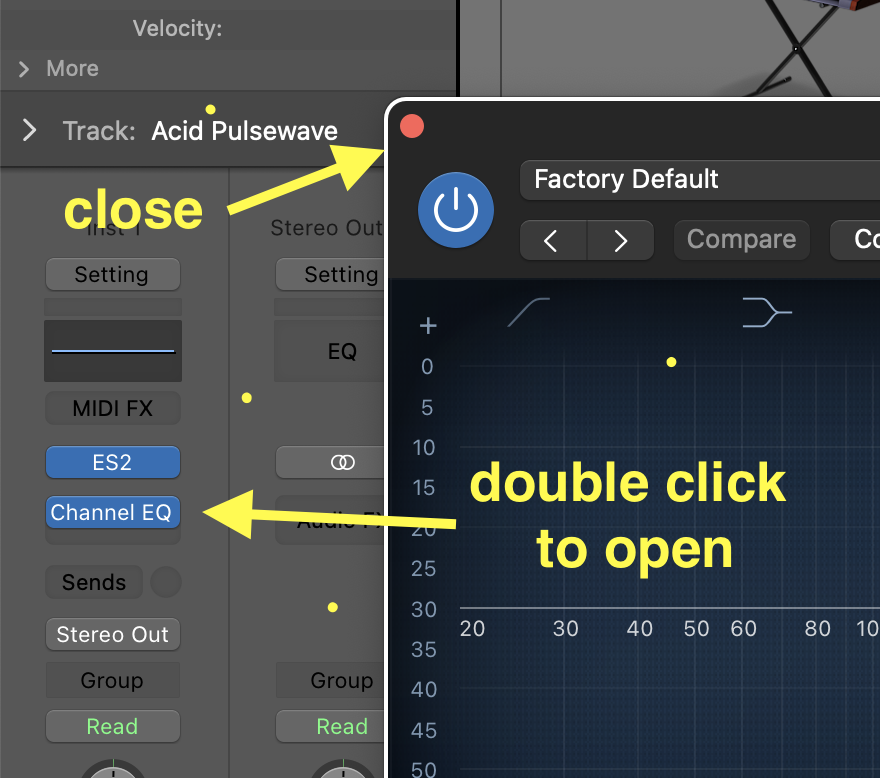 • The EQ window will automatically open. To close it, click on the RED circle at the TOP LEFT of the EQ window; to open it again, double-click on the plugin slot.