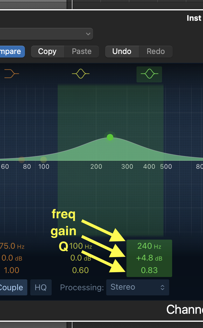 • Try the shelf filters and band filters. Always make sure you hear the effects of the parameter you're using.