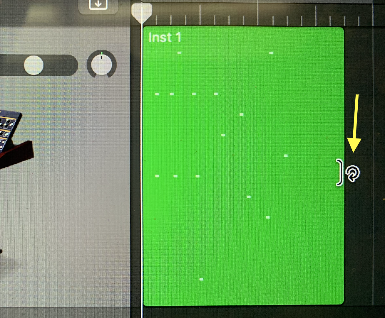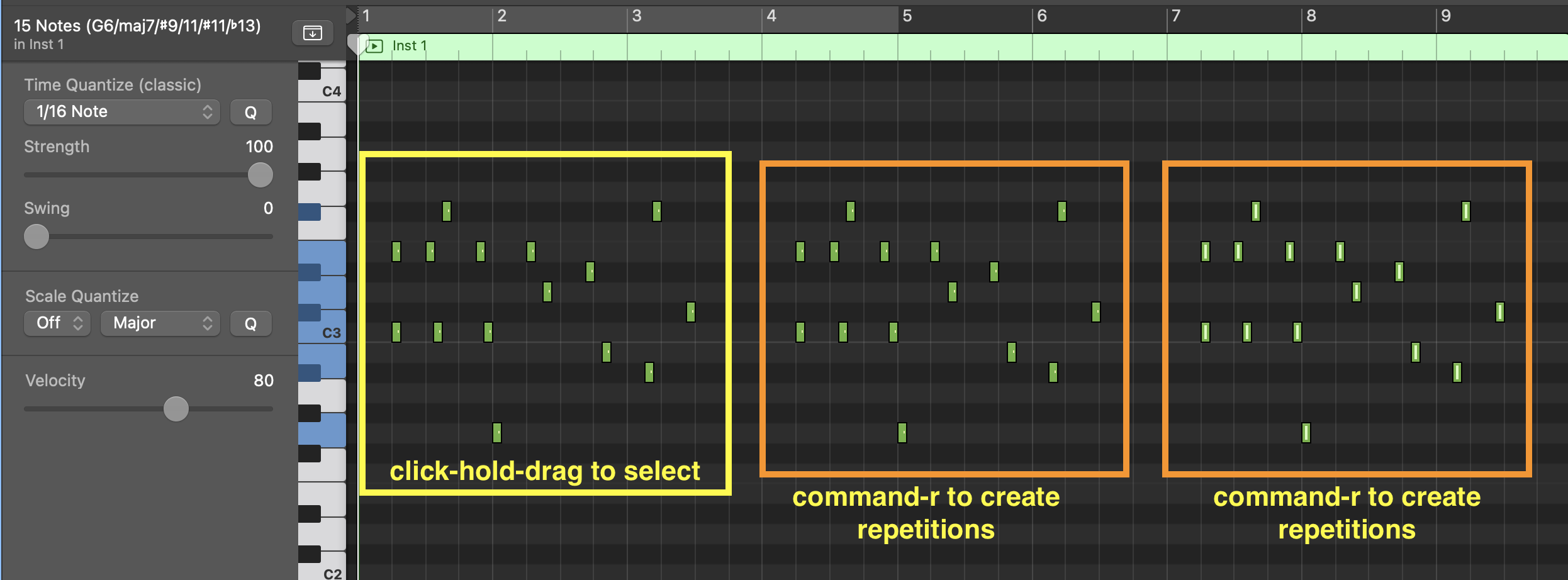 2) Press "command-z" to undo what you just did, then press the "p" on the computer keyboard to exit the piano roll. In the arrange window, move your cursor to the center of the right edge of the MIDI-region. The cursor will change to a circle with an arrow. Click-drag to the right to create loops.