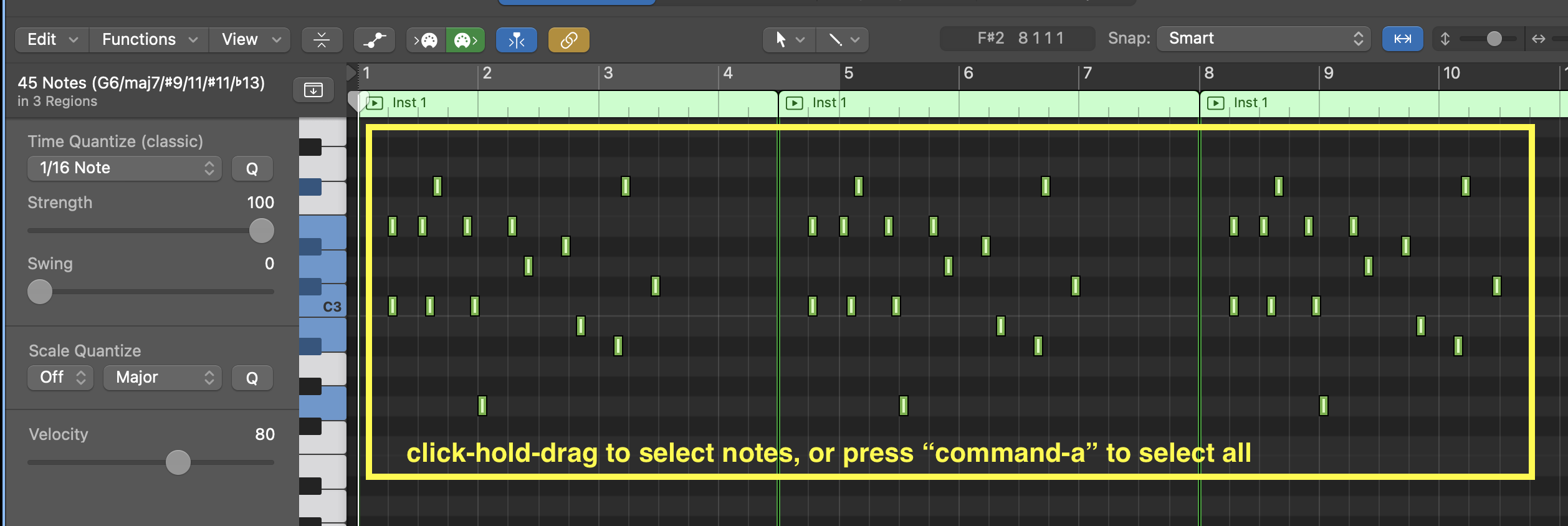 • Type "a" to turn OFF the automation mode, select all three loops you've created, and double click on them. This will open the "piano-roll" editor. Click-hold-drag to select all the note you played.