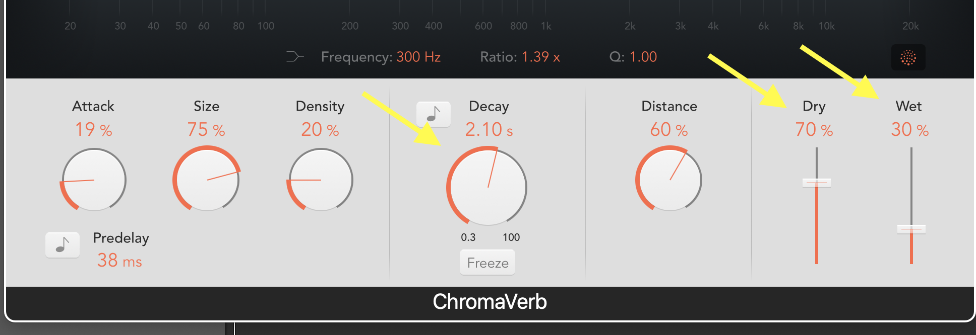 • Start the playback, then adjust the DRY and WET controls as discussed in class so that your improv sounds FAR AWAY (i.e., low DRY, higher WET). Then re-adjust the DRY and WET controls so that your improv sounds VERY CLOSE (i.e., high DRY, and low WET). Try out the DECAY control (and any other control). Make sure you can hear the effect of your changes.