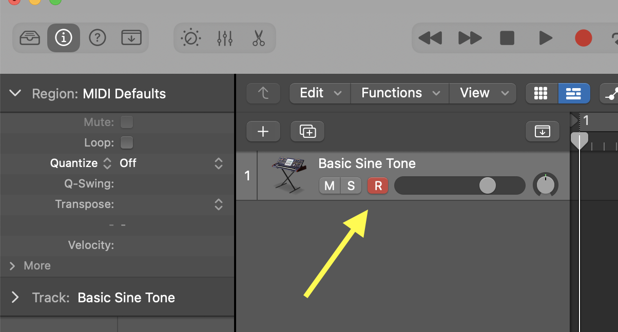 • Click on the RECORD ENABLE button on the track, so that Logic listens to the Keyboard.