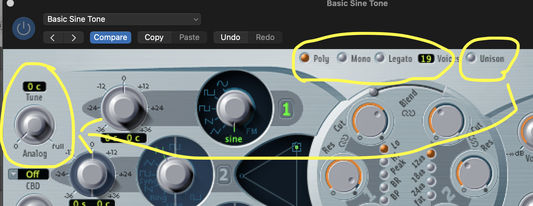 • Start by trying the POLY, MONO, and LEGATO modes, along with the number of voices. How does each one affect the sound? Try the UNISON mode; remember that this works in conjunction with the "ANALOG" knob. How does each one affect the sound?