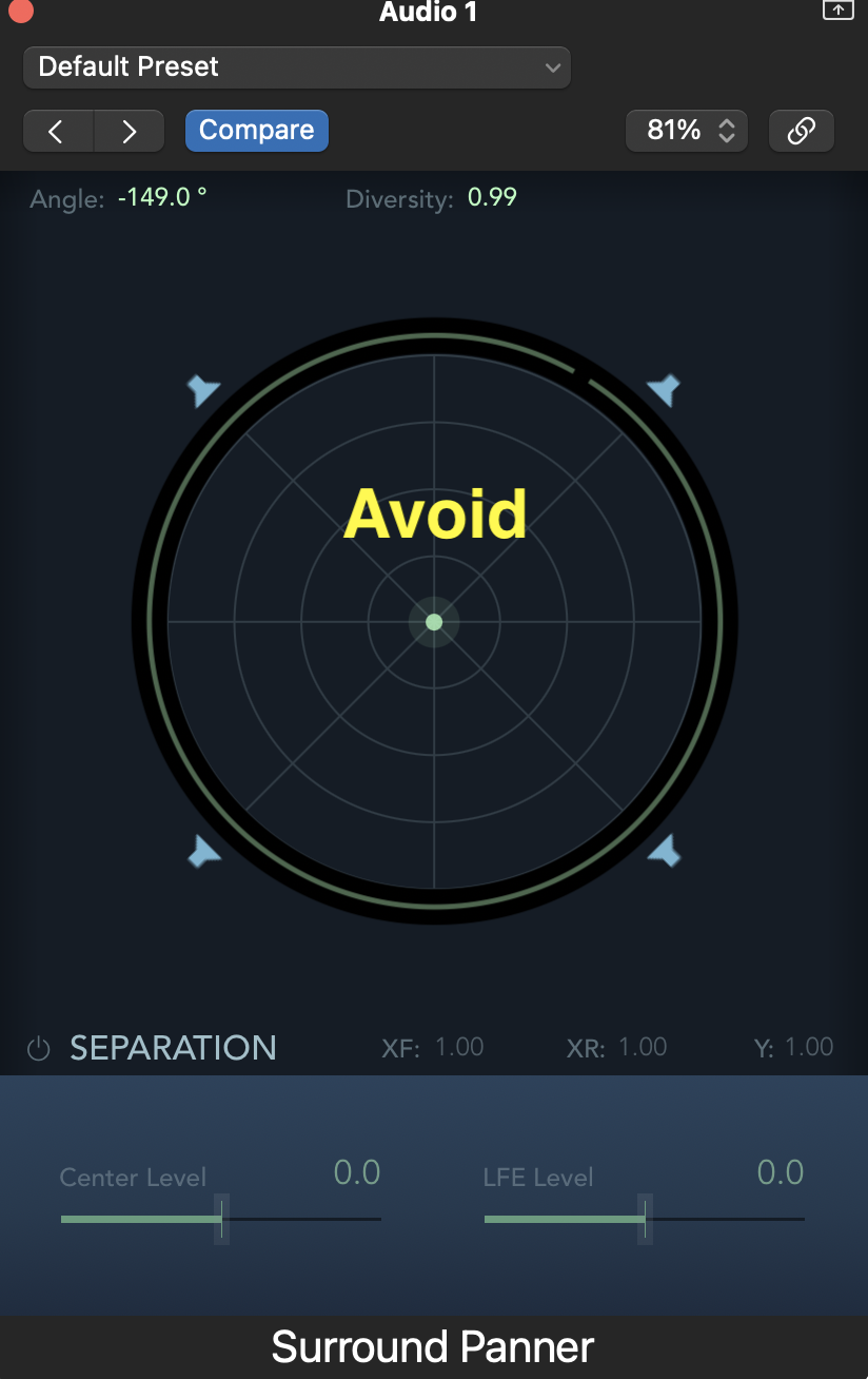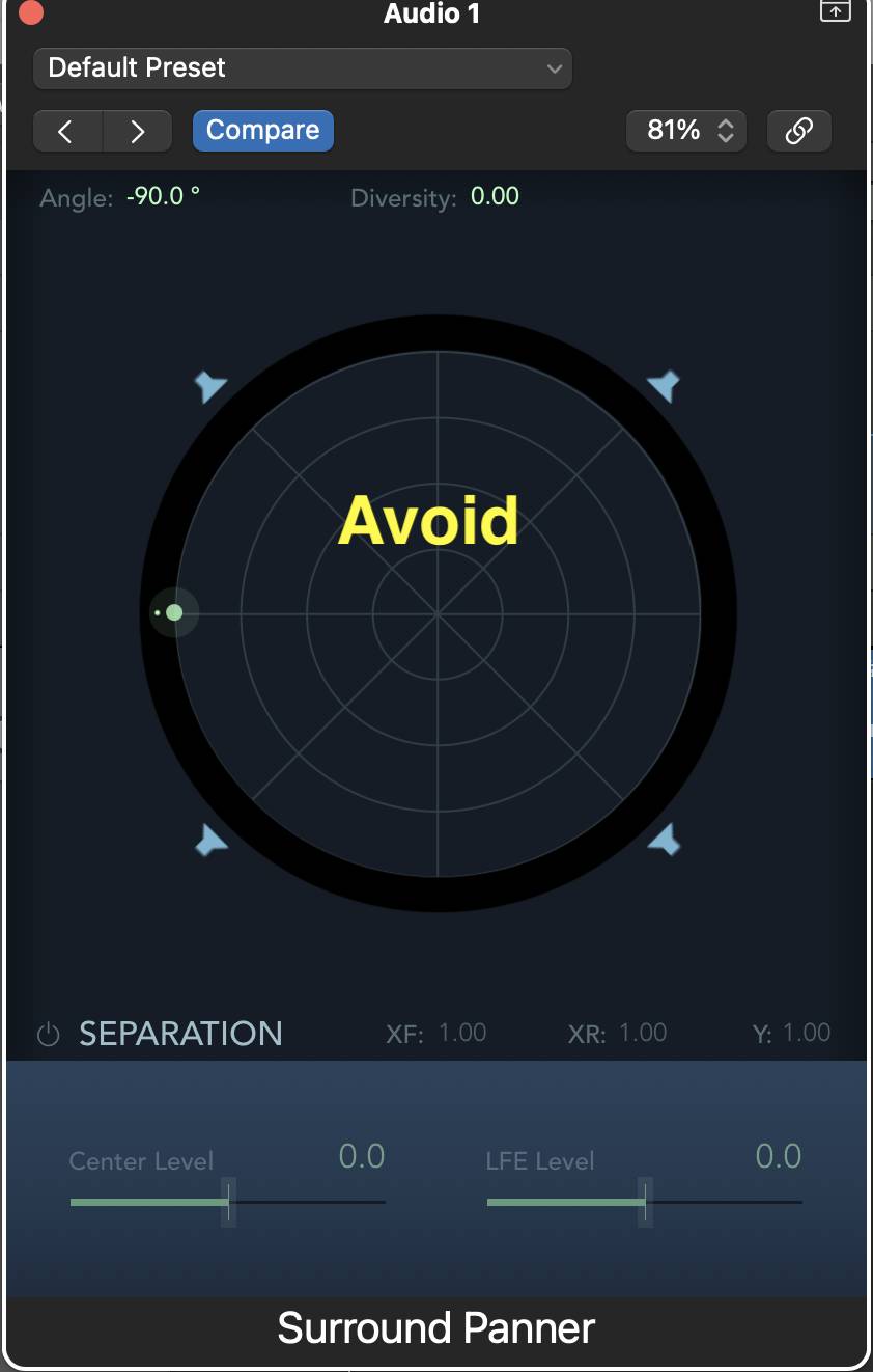 1) Avoid using the middle position with the surround panner. This simply spreads the sound evenly to all speakers and makes it louder, but not more spatial sounding, and listeners sitting close to a speaker won't hear the sound coming from the other speakers.