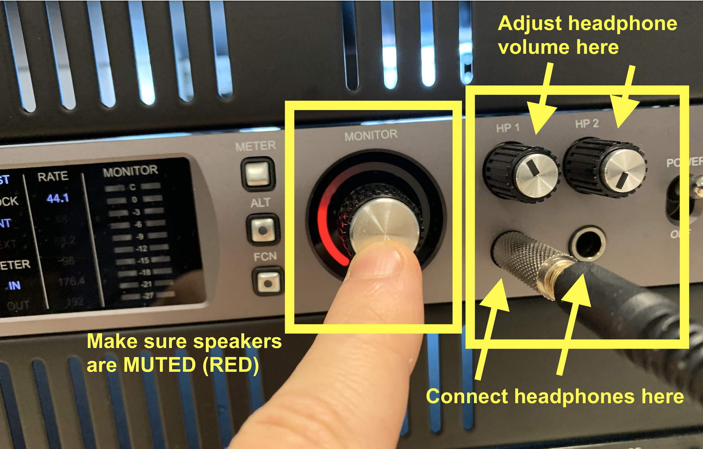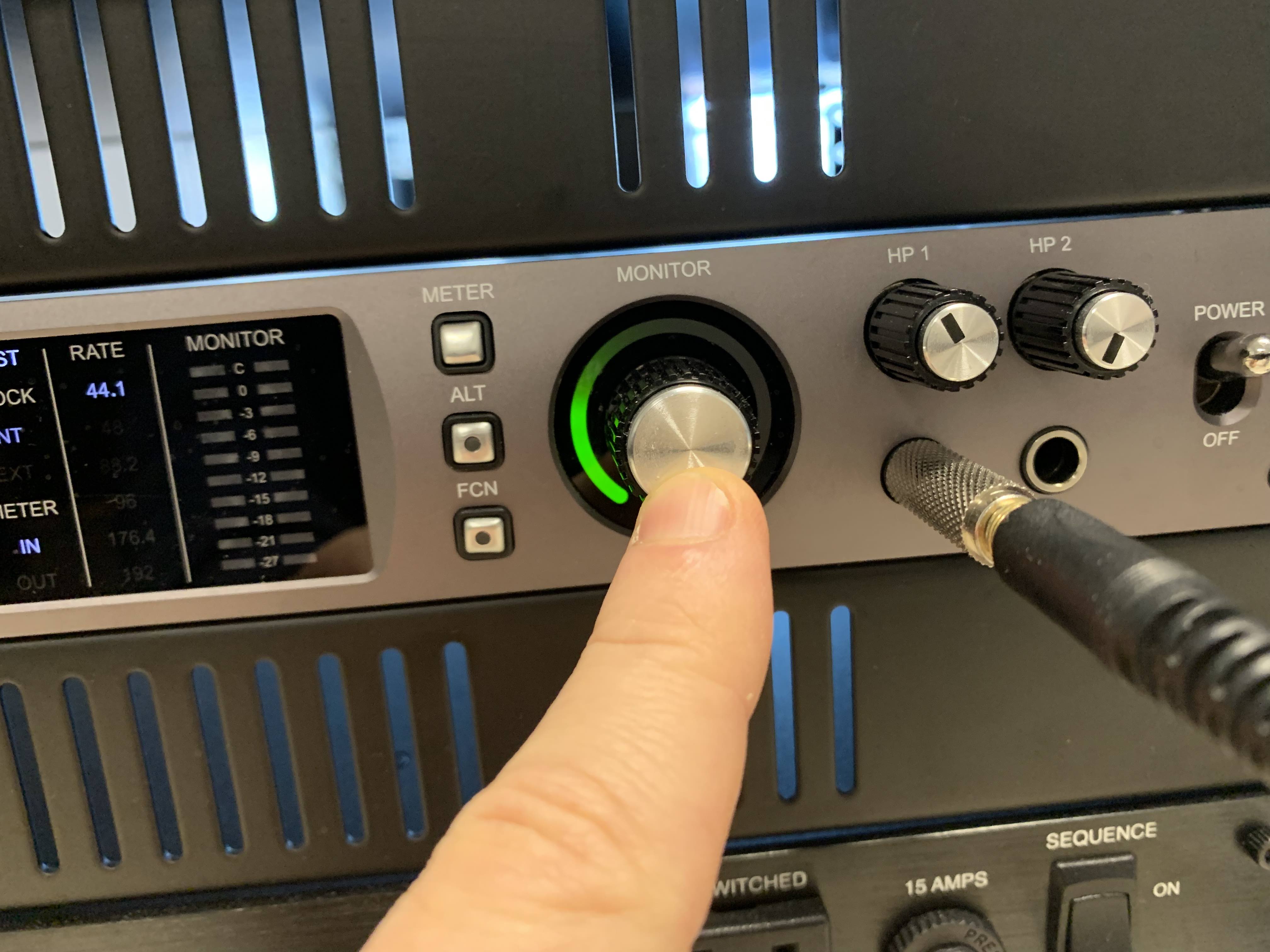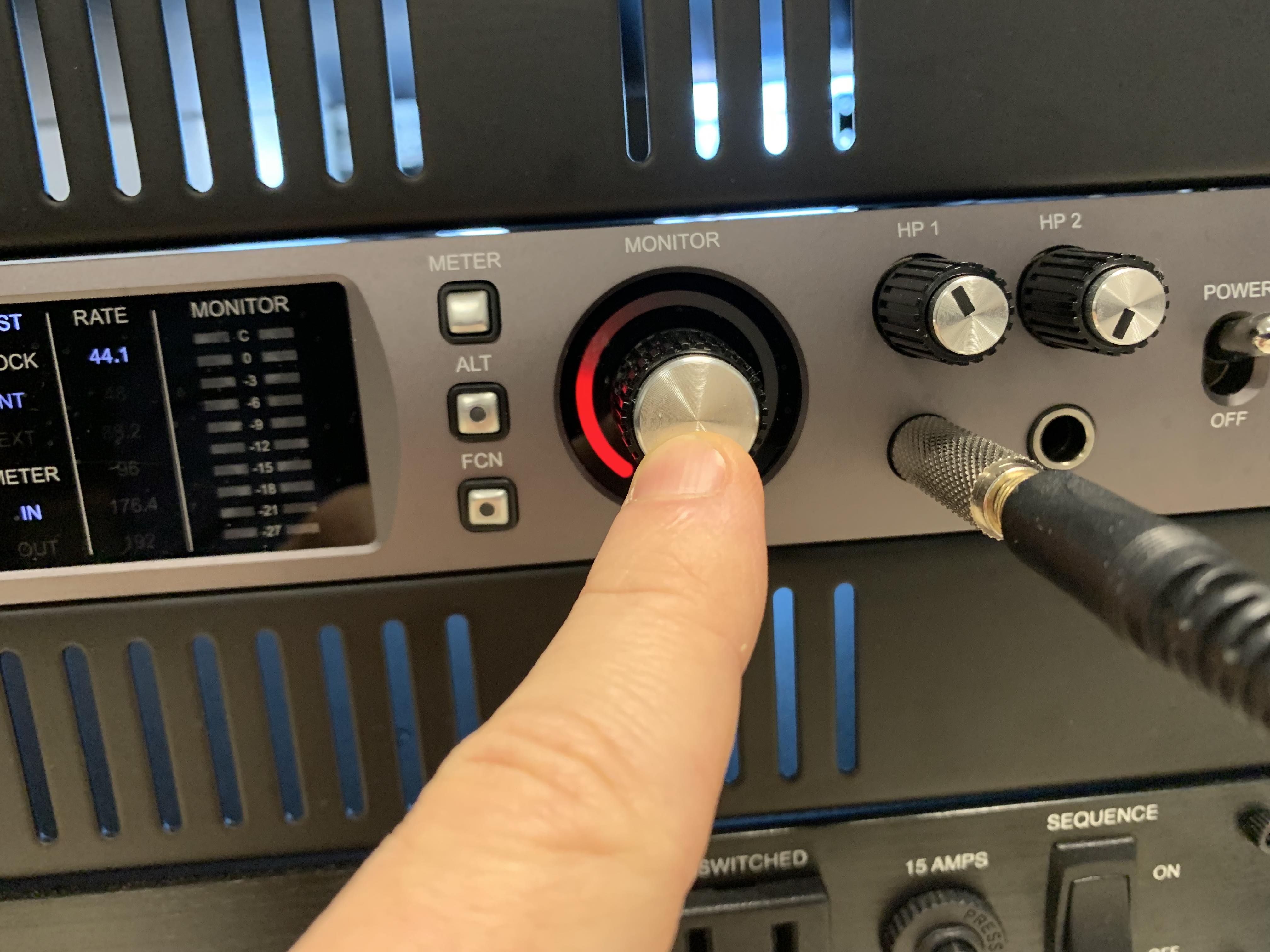 4- Make sure the speakers are muted (push the "Monitor" dial on the Apollo so that it turns RED).
