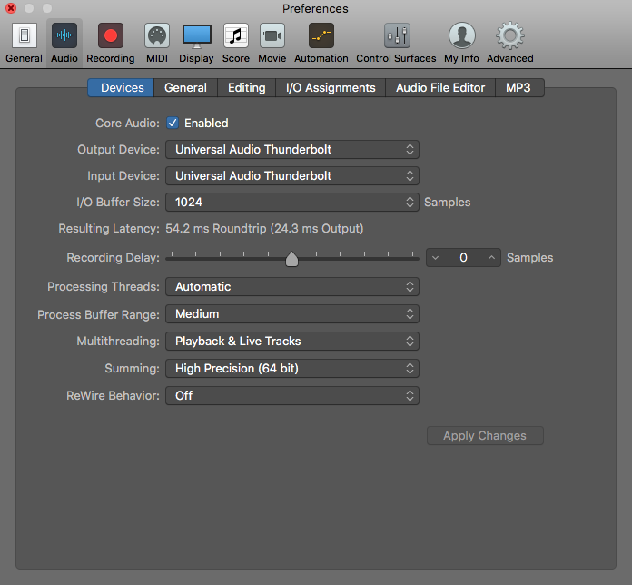 3- In logic, go to the preferences -> Audio -> devices, and make sure "Universal Audio Thunderbolt" as the Input and Output device (this is Logic's name for the Apollo X8).