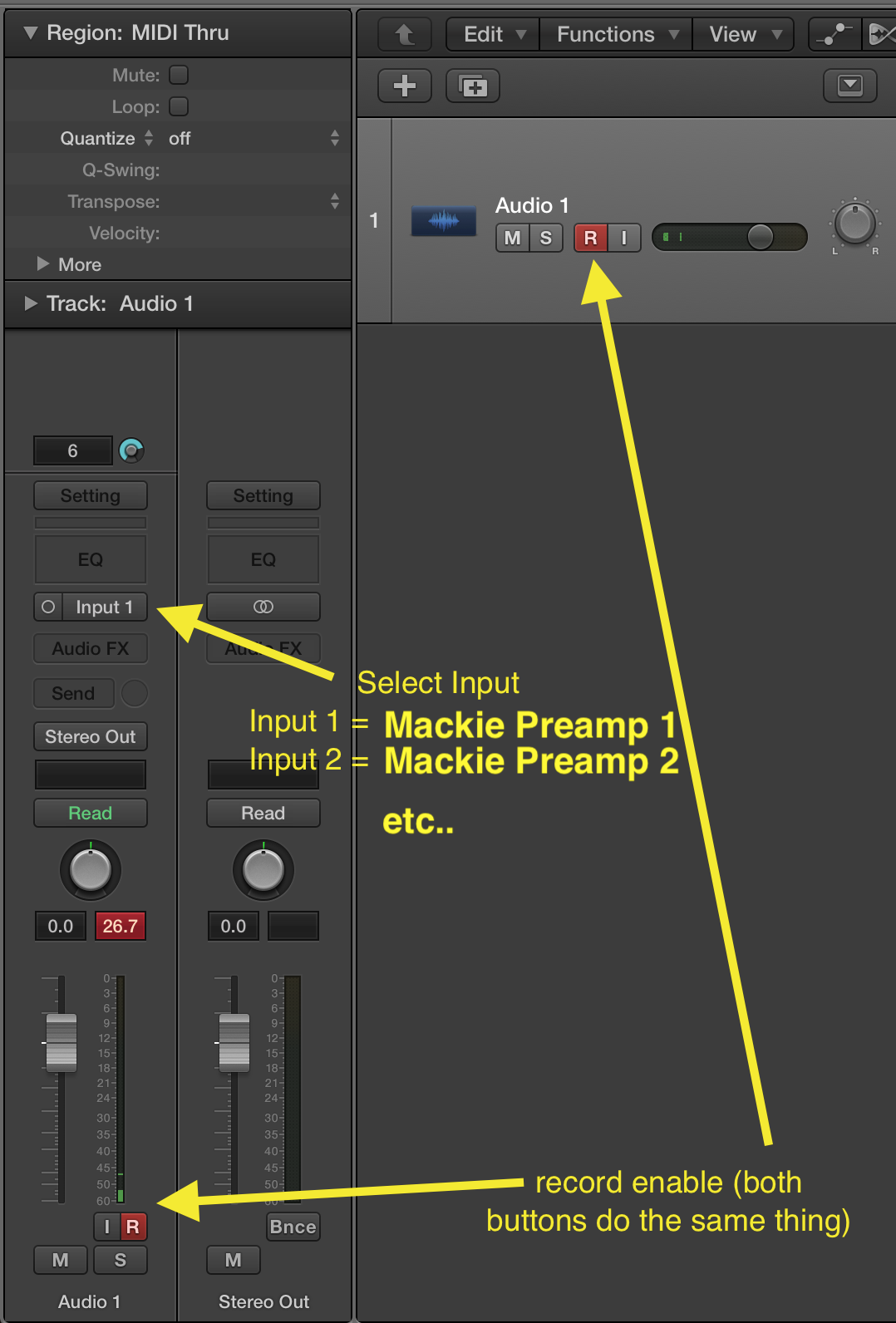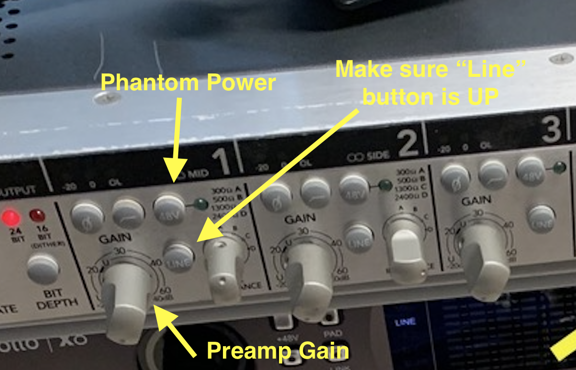 IMPORTANT: if your recording is very quiet, DO NOT simply raise the faders in Logic's mixer. You MUST raise the Preamp dial on the Apollo and re-record.