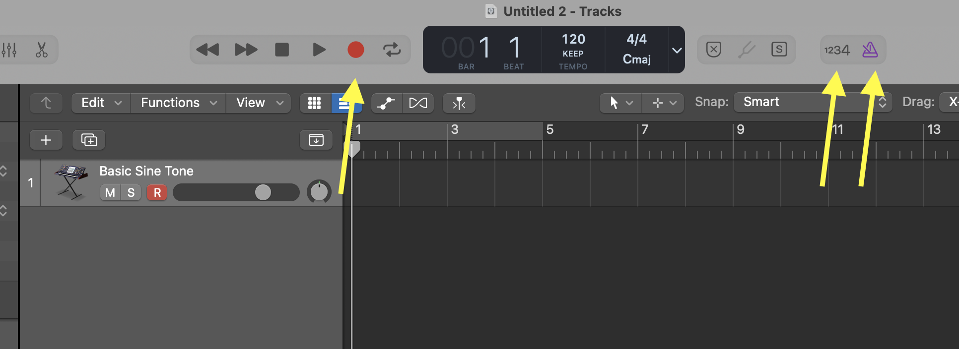 • Click on the RECORD ENABLE button on the track, so that Logic listens to the Keyboard.