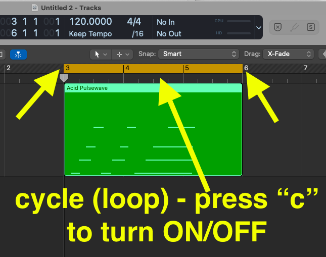 • To create a cycle around you improvisation (i.e., looping the playback), click on the midi region that you just created, and hit "command-u" on the computer keyboard. This will make a cycle area around your region, which you will see as a yellow band at the top of the arrange window. You can press the "c" computer key to turn on and off the cycle. You can also click and drag the left and right end of the yellow band to adjust the cycle length.