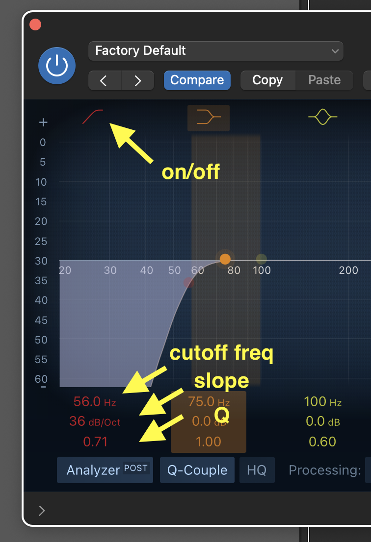 • On the EQ, turn-on the low-cut filter, and play around with the frequency, slope, and Q. Make sure you can hear the effect of each parameter. Do the same for the high-cut filter.