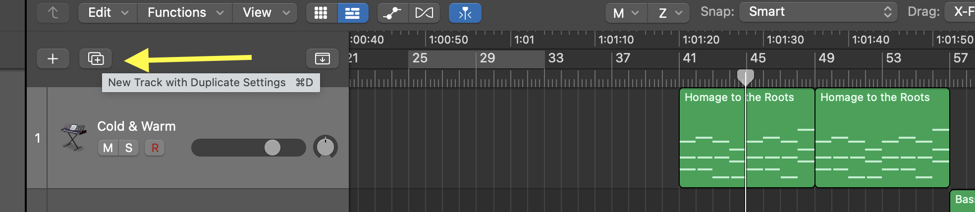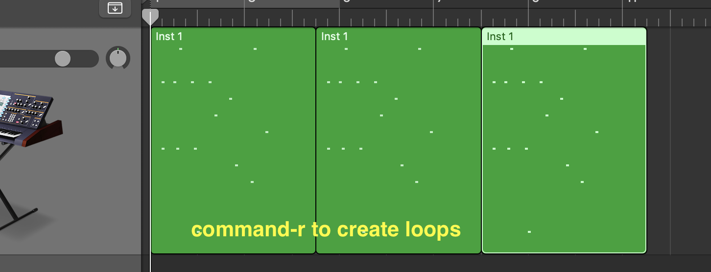2) Press "command-z" to undo what you just did, then press the "p" on the computer keyboard to exit the piano roll. In the arrange window, move your cursor to the center of the right edge of the MIDI-region. The cursor will change to a circle with an arrow. Click-drag to the right to create loops.