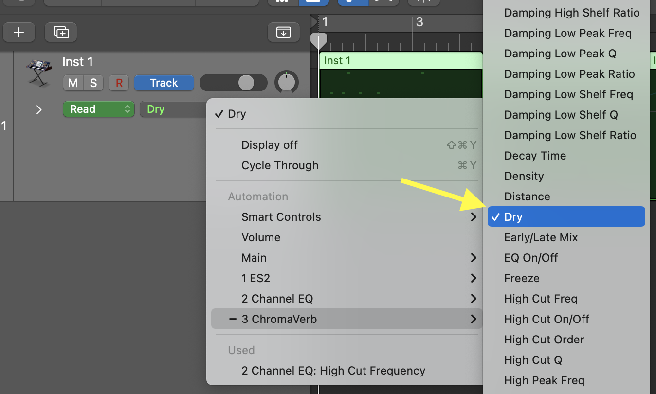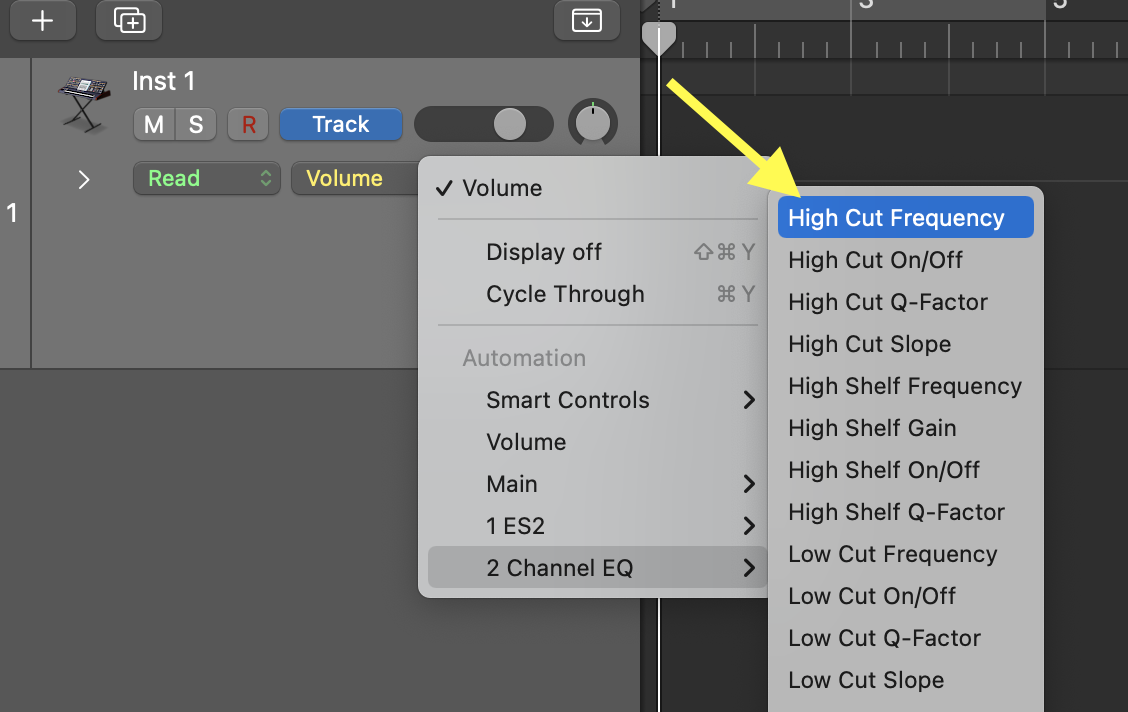 • Hit the "a" key on the computer keyboard (this turns-on automation), then choose "High-Cut Frequency" from the menu on the track. Make sure the high-cut filter is turned ON in the EQ.