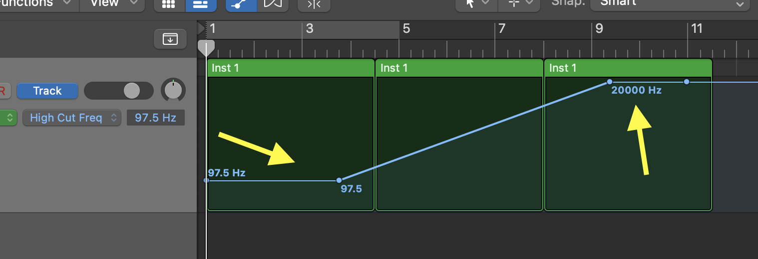 • Towards the beginning of the MIDI region, click on the line on the track to create an automation point, then drag this point to about 100Hz; then click to create another point towards the end of the third loop, and drag this point to 20,000Hz. You can use the eraser tool to delete automation points (hit "t" to open the tool palette, then choose the eraser tool).