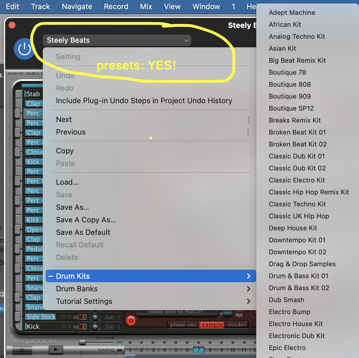 • On the new track, load the ES2 synth, and choose a preset that you like. To do this, simply choose the first preset on the list, then, WHILE PLAYING ON THE KEYBOARD, click on the LEFT and RIGHT arrows to go to the next preset. Stop when you find something you like; however, choose something that's harmonically rich (not just pure sine tones).