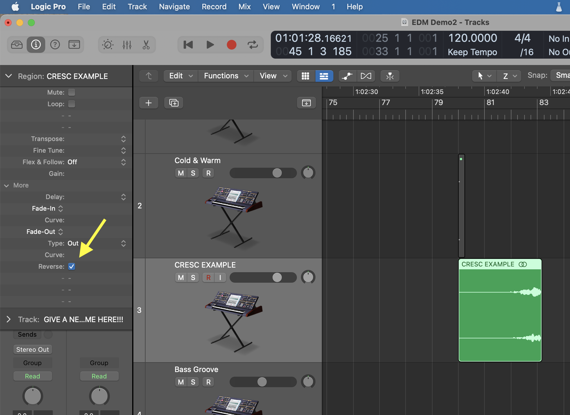 • Click on "reverse" in the Region editor.