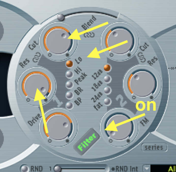 • Turn on the FILTER, make sure FILTER 1 (on the left) is set to LO mode, then play around with the CUT knob. What is going on? Try changing the RES knob.