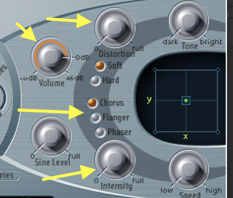 • Add some DISTORTION, and some CHORUS (also try FLANGER or PHASER); adjust the VOLUME if it gets too loud.