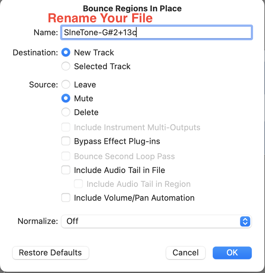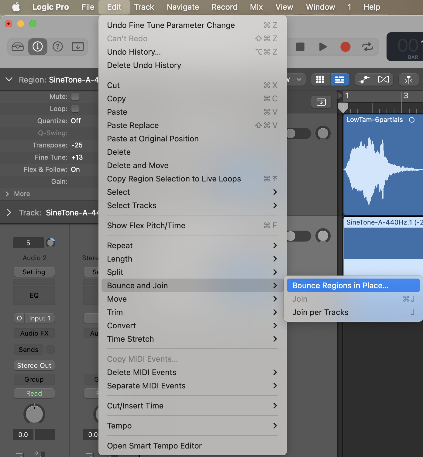 • Once the SineTone file is properly tuned, convert it to a new audio file by choosing "Bounce and Join->Bounce Region in Place" from the "Edit" menu.