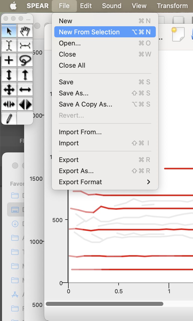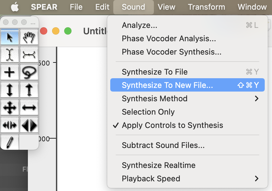 • Do any number of transformations on the sound using Spear's tools (as demonstrated in class last week). Once satisfied with the result, choose "Synthesize To New File" from the "Sound" menu, and save your processed sound somewhere on your computer.