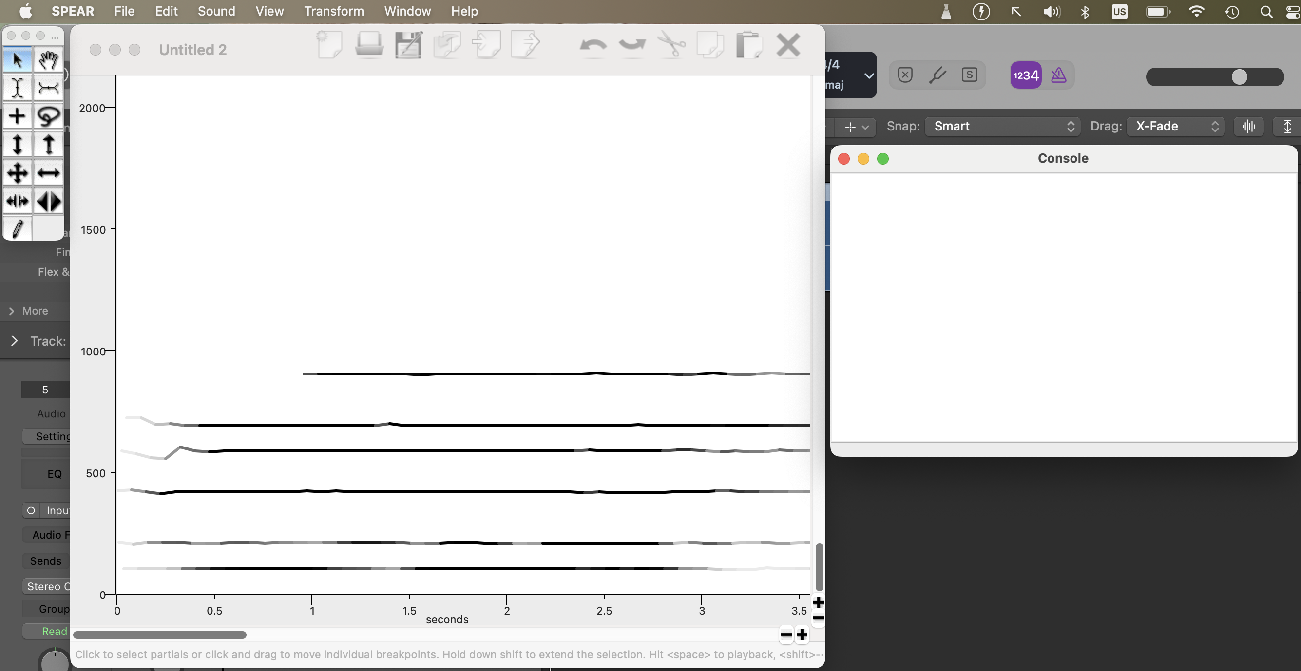 • Still in Spear, open the processed sound you just created, and select/listen to various partials to find some that you find sonically interesting. Remember that you can hit shift-space to play back only the partials that you've selected with the arrow tool.