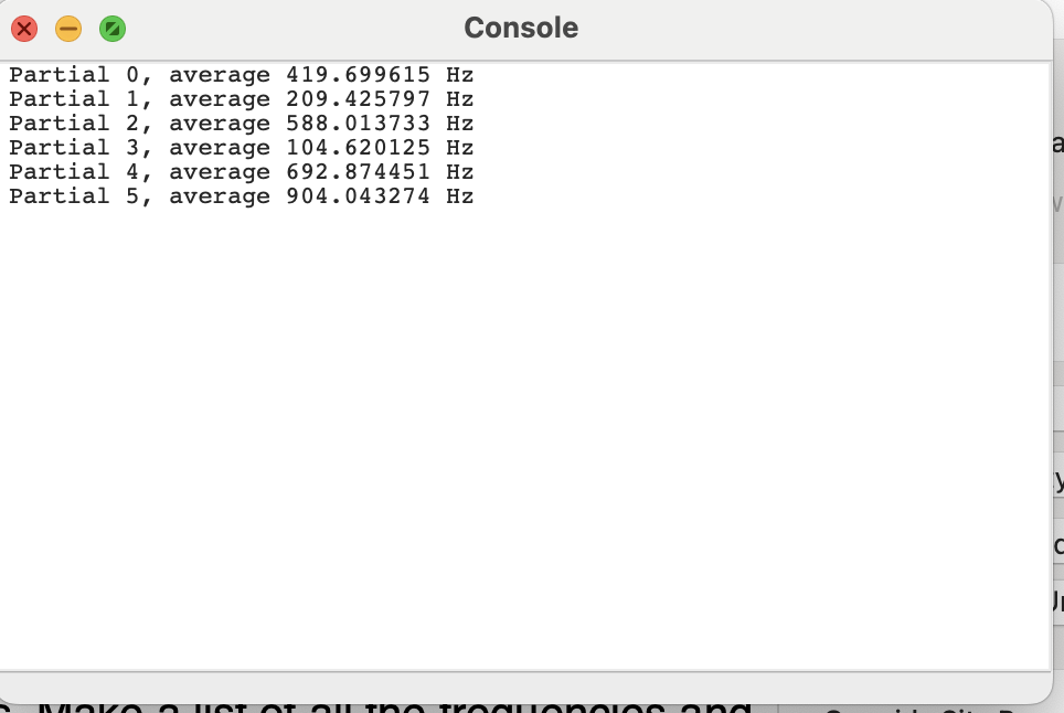 • Hit command-A to select all the partials in the analysis window. Then choose "Print Average Frequencies" from the "View" menu. You will see appear all the frequencies of the partials in the console window. Note that these will NOT be in ascending order.