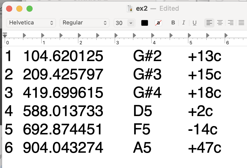 • One by one, in ascending frequency order, copy the frequency number into this online calculator, to covert the frequencies into pitches, as shown in class. Make a list of all the frequencies and corresponding notes in a text document.