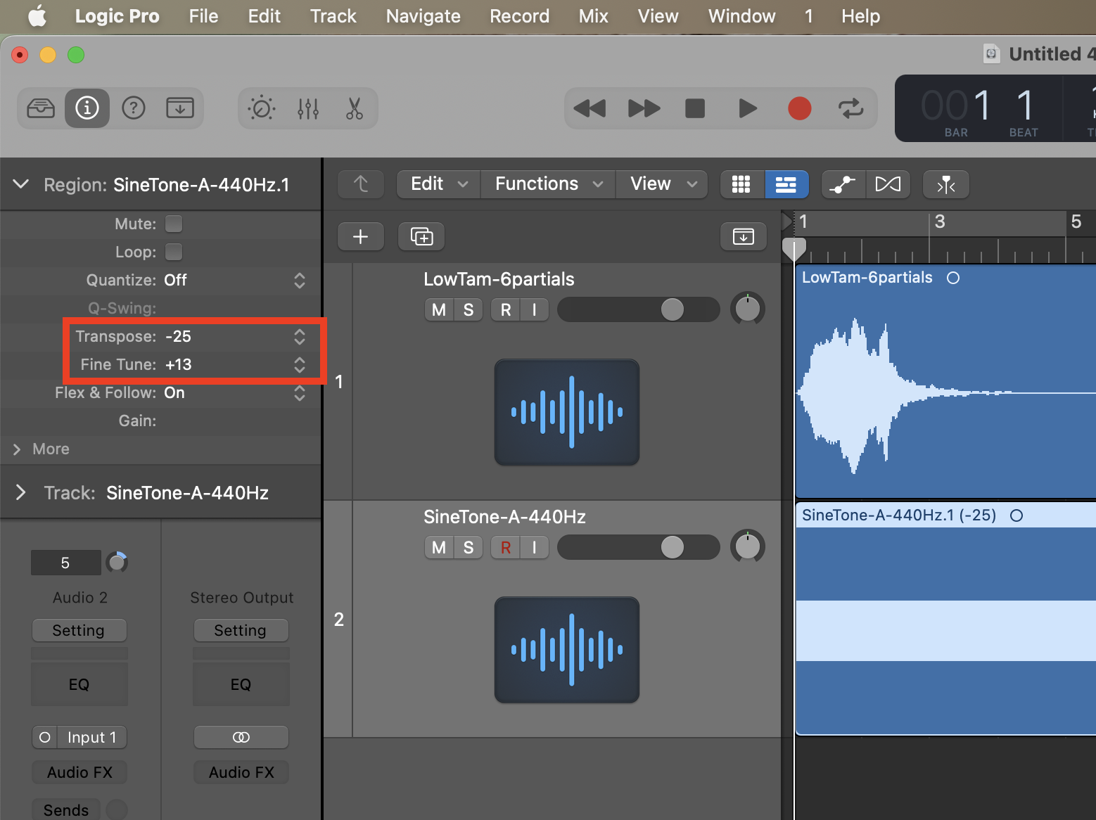 • Select the SineTone file, then go the Region Editor (top left). There, use the Transpose and Fine Tune sections to tune the SineTone file to one of the partials, as shown in class. For example, if a partial has a pitch of G#2 + 13 cents, then you will have to transpose the SineTone file by -25 semi-tones (= 2 octaves and 1 semi-tone), +13 cents. Note that C4 is middle C.