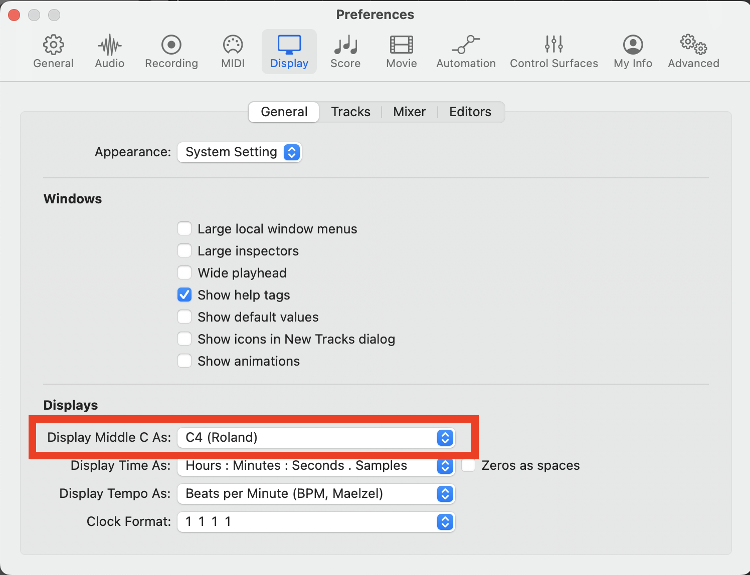 Note that, by default, middle C is NOT C4 in Logic (it's C3). To change middle C to C4, go to Logic->Preferences->Display->General