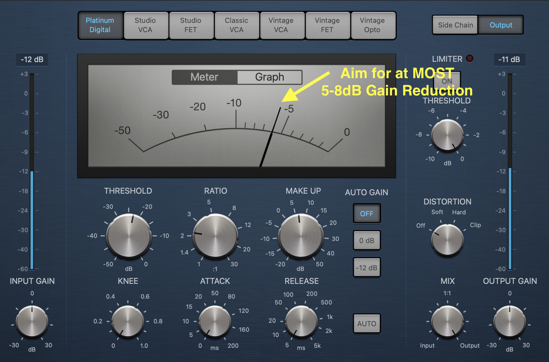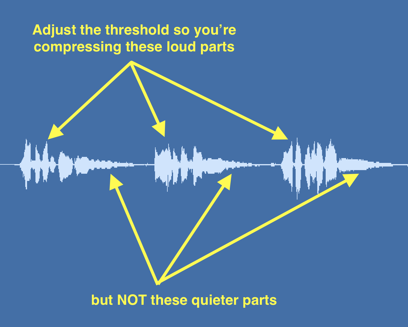Then add a compressor to make the voice more even. Here, set the threshold so that you're only compressing the loudest parts of the voice. Consider using a very fast attack and release, and enough ratio so that you have at most about 5-8db of gain reduction.