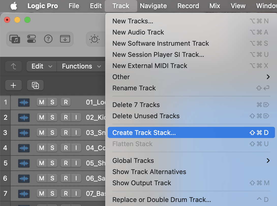 • Once you've gone through all the tracks, start your mix with the drums (kick, then snare, then hats, then overheads). REGULARLY compare with the reference track (use the option-click on SOLO command to solo individual tracks), but don't obsess too much if it's not exactly the same. The idea is to get close, then move on to the next instrument, and come back to make more adjustment a little later.